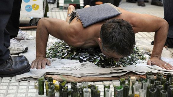 Na zdjęciu: 34-letni brazylijski fakir, Antonio da Luz, kładzie się na potłuczonym szkle i pozwala mężczyznom wyłowionym z tłumu stawać na swoich plecach. Pokaz zorganizowany na ulicach Florydy.