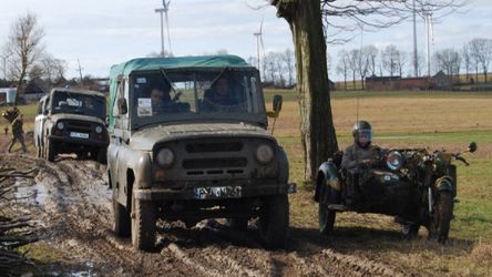 Błotne potwory Piękne błękitne niebo i ciepły wiatr od morza wywoływały uśmiech na twarzach wszystkich, którzy przyjechali na darłowską patelnię. Gorzej było już z jazdą po terenie. Twardy latem grunt, zimą zamienił się w wielką błotnistą breje. Nie zabrakło jednak chętnych do nurkowania w jej odmętach. Terenówki topiły się jedna za drugą… I jedna za druga wyciągały się nawzajem. W ostateczności na pomoc nadjeżdżały ciężarówki. Choć i im zdarzały się błotniste wtopy. - to nie tylko sprawdzian dla naszych maszyn- mówi Tomek z Gdyni - _ dzięki takim spotkaniom można sprawdzić, na kogo można liczyć i w jakich okolicznościach. Naszego Iltisa wyciągała ta sama załoga Land Rovera Santany kilka razy, nigdy nie odmówili pomocy, choć pozrywaliśmy im wszystkie liny holownicze. Nikt też nie narzekał, że musi po pas przy dwóch stopniach wejść do wody._ Wędrówki