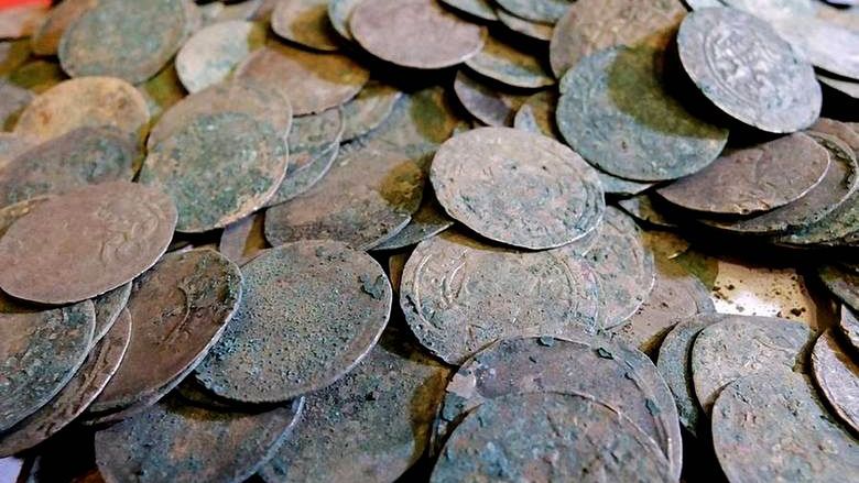- 1385 monet o średnicy 27 mm wydobytych z ziemi, mocno zniszczonych, prawdopodobnie pochodzących ze średniowiecza.